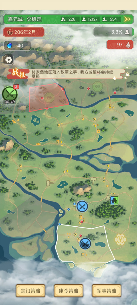 4、开始游戏,你要在游戏中通过实施各种政策来获得支持、发展地盘,指挥优秀的门派弟子阻击敌人,依靠灵活多样的战略将敌人驱赶出这片土地