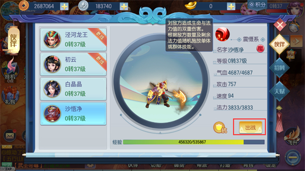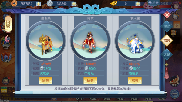 伙伴其实就是游戏剧情中的一些角色,比如白晶晶、齐天大圣、袁天罡等等。我们在达到对应的等级之后便能把他们召入自己的阵营中,协助自己战斗。有伙伴的协助,即使是在单人战斗的场景,玩家也能更加轻松自如地应对。招募伙伴除了需要达到该伙伴招募所要求的等级之外,部分伙伴还需要支付一定的招募费用,根据招募的伙伴不同,支付的货币也不同,可能是铜钱、银两、元宝中的一种。