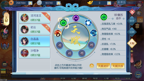 除了主动技能之外,每个伙伴都拥有9个专属天赋技能。每个天赋技能都能为伙伴提供不同的属性加成,每个伙伴的天赋技能组成也有所不同。9个天赋并不是一开始就全部解锁的,而是随着伙伴等级的提升逐步解锁。除了通过提升等级解锁天赋之外,我们还能通过进阶和洗练增强伙伴天赋带来的属性加成。进阶很好理解,就是直接强化当前天赋的属性加成。洗练则是随机产生一组新的属性,玩家可以选择用新属性替换旧属性或是保留旧属性。洗练虽然不能像进阶那样稳定增长,但是一旦人品爆发就会带来质的变化,而且第一次洗练一般都是稳赚不赔的。