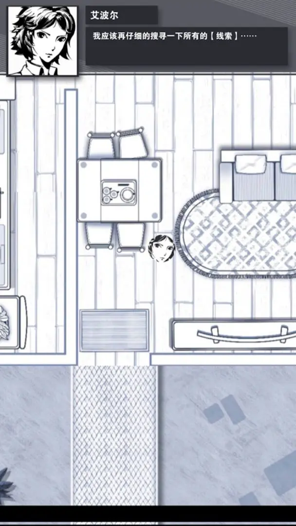4.(躲避凶徒:等待凶徒往上走再开始移动,第一次走到左下角的沙发缝隙,第二次走到厨房的桌子旁边,第三次按照艾波尔的指示,等到她说可以走了,再往上走到楼梯)