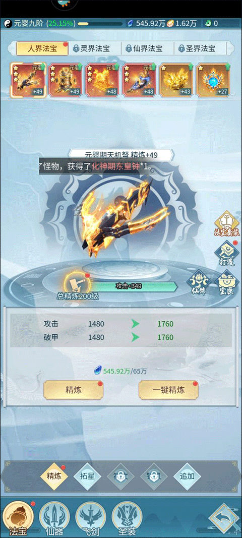 当然不仅仅只有提升仙兽才能提升玩家的战力,法宝也是很关键的一环。法宝内包含了法宝、仙器、飞剑、圣装4个功能,每个功能提升对玩家的战力来说都是翻天覆地的变化,我们就以法宝为例,法宝和仙兽一样被分为人界、灵界、仙界、圣界4个品阶、品阶越高提升越高,拥有法宝后我们需要对法宝进行精炼,每精炼一次就能给玩家提升一点,虽然并没有提升一次就是质的飞跃,但日积月累下来,提升的占比也会越来越重,除此之外玩家还能给法宝进行打造,将法宝打造成更高品质的法宝提升一次战力就会有大幅度的增长,玩家就需要收集打造所需的材料,材料都是能通过游戏内的副本和商店获取的,非常简单。