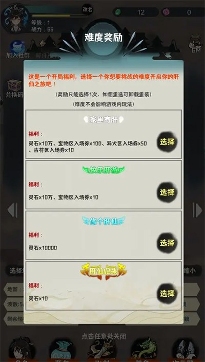 2、进游戏记得左上角【难度选择】玩法先选一个游戏难度,这个难度不涉及到游戏内任何玩法数值,只是不同难度会发一波初期奖励,难度低的奖励多一些可以快速度过开荒期。(想体验极限肝度的欢迎选择最后1个难度)
