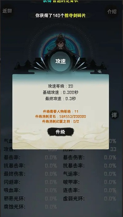 3、前期的灵石建议优先在人物面板升级攻速,前期攻速带来的提升是巨大的,其次升级飞剑,初期飞剑带来的攻击气血还是非常多的,装备刷到了就立马换上,尽快打过50层后挑战升品台解锁2品装备。