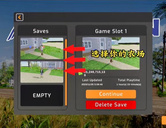 2、进入游戏后,选择好自己的农场,点击“continue”继续游戏