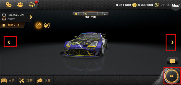 1、开始比赛前可以先点击左右栏切换赛车,选中中意的赛车后,点击右下角标志开始比赛