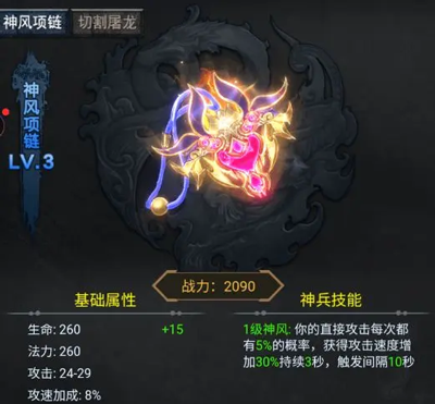 神风项链升阶增加生命,法力,攻击,攻速加成。技能升级增加攻击速度,使直接攻击有几率触发攻击速度加成。