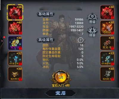 宝石:在装备上镶嵌宝石可以增加属性,宝石分为绿宝石,蓝宝石,紫宝石,红宝石,橙宝石,黄宝石。分别增加生命,伤害减免,攻击吸血,攻击,伤害加成,防御。可以通过合成系统合成更高等级的宝石。宝石总等级均达到指定等级可以获得生命,法力,攻击,HP加成,攻击加成,受到怪物免伤属性。每件装备初始可镶嵌1颗宝石,可以使用打孔石或者灵符进行开孔。最多开启3个孔。更换装备后需要重新开孔。宝石可以通过镇魔塔,商城,BOSS掉落,活动获得。