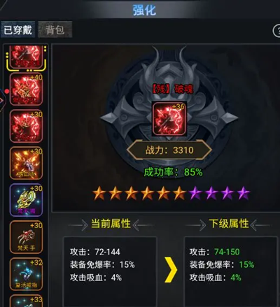 装备强化:装备强化需要消耗道具和元宝进行升星。强化星级越高消耗材料越多。装备升星可以获得攻击,装备免爆率,攻击吸血,防御,伤害减少,暴击几率,暴击威力,忽视目标防御,攻击加成,防御加成,HP加成属性。更换装备后可以使用元宝或者传承晶石转移强化星级。升星道具可以通过商城,BOSS掉落,活动的方式获得。